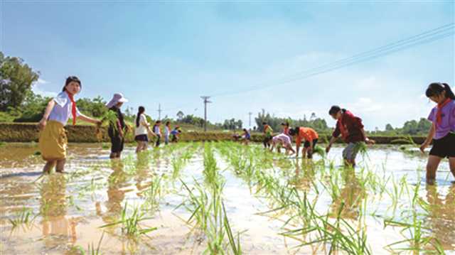 5月16日,梁平雙桂湖國(guó)家濕地公園南岸稻田,城里娃娃們正在跟著工作人員學(xué)習(xí)插秧。