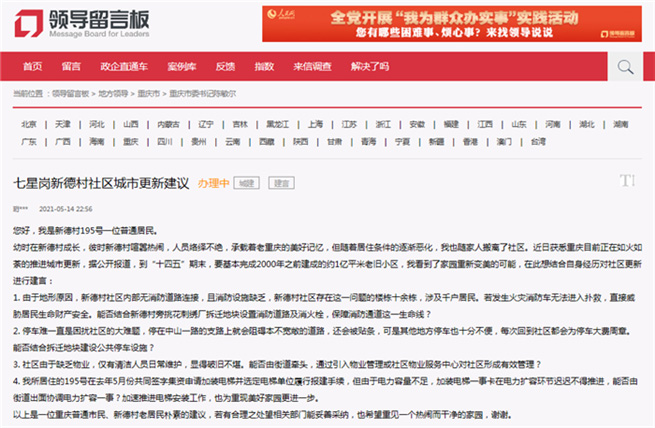 人民網重慶5月20日電 (陳琦)“幼時在新德村成長,彼時喧囂熱鬧,承載著老重慶的美好記憶……”近日,有熱心網友通過人民網《領導留言板》留言,對重慶正在積極推進的城市更新行動——老舊小區(qū)改造,提出建議,希望自己曾經居住的七星崗新德村老社區(qū)煥新蝶變。
