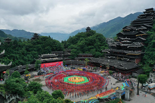人民網(wǎng)重慶5月20日電 伴隨著歡快的鼓點(diǎn),苗族經(jīng)典民歌《嬌阿依》的音樂響起,萬余名身著盛裝的苗族兒女在彭水縣蚩尤九黎城跳起來,共慶苗族傳統(tǒng)節(jié)日。5月19日,2021·第十屆中國烏江苗族踩花山節(jié)暨中國·彭水水上運(yùn)動(dòng)大賽分別(以下簡稱“一節(jié)一賽”)在彭水苗族土家族自治縣蚩尤九黎城和烏江彭水縣城水域精彩啟幕。