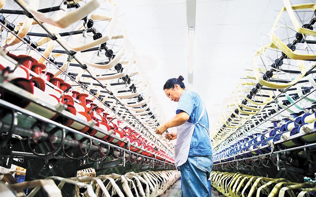 5月13日,女工在黔江區(qū)花神紡織公司生產車間進行并絲操作。
