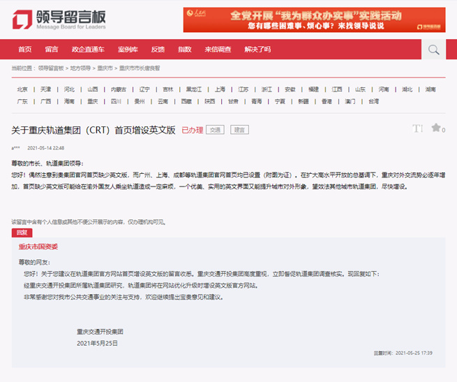 網(wǎng)友建議重慶軌道集團官網(wǎng)增設(shè)英文版