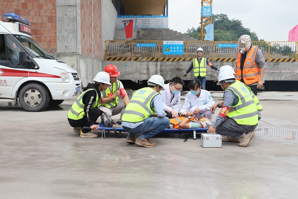 “立即啟動(dòng)火災(zāi)事故應(yīng)急預(yù)案,撥打報(bào)警電話,通知各救援小組立即趕赴現(xiàn)場(chǎng)!”隨著項(xiàng)目經(jīng)理秦自力的一聲令下,工地各應(yīng)急救援小組及時(shí)趕到“事故現(xiàn)場(chǎng)”,拉起警戒線,有序疏散人員并對(duì)傷員展開緊急救援。隨后,醫(yī)療人員與消防官兵也及時(shí)趕到了現(xiàn)場(chǎng),對(duì)傷員進(jìn)行治療,迅速撲滅火源。