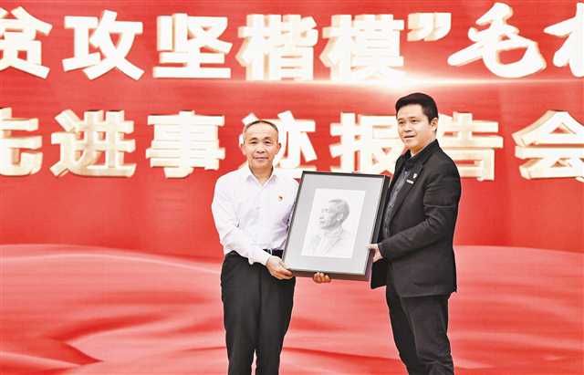 五月二十六日,四川美術(shù)學(xué)院院長(zhǎng)龐茂琨向毛相林贈(zèng)送自己創(chuàng)作的毛相林肖像畫(huà)。記者 齊嵐森 攝\視覺(jué)重慶