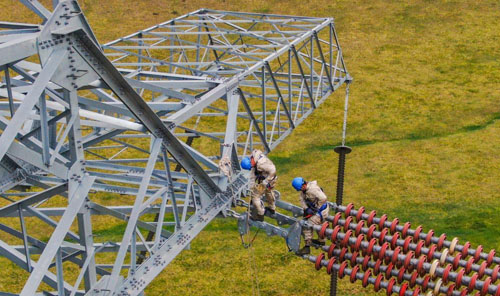 5月31日,檢修人員在錫盟—泰州±800千伏特高壓直流輸電工程內蒙古段的輸電線路桿塔上更換絕緣子(無人機照片)。
