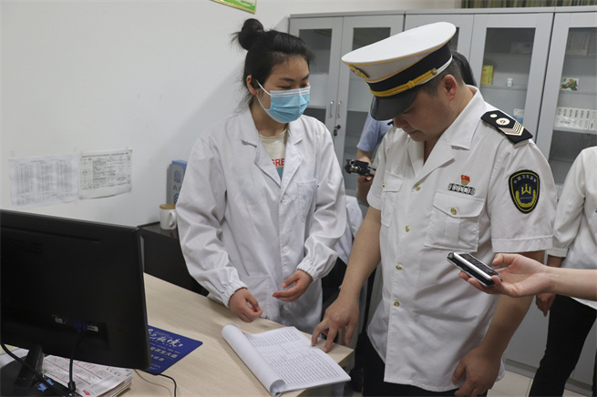 圖為執(zhí)法人員查看學校晨午檢數(shù)據(jù)登記表。陳琦攝