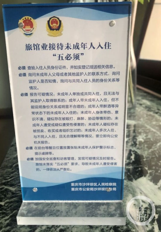 6月2日,重慶市檢察院發(fā)布消息,從今年5月開始,沙坪壩區(qū)1000余家旅館統(tǒng)一在登記臺(tái)的醒目位置放置《旅館業(yè)接待未成年人入住“五必須”》警示牌,并悉數(shù)簽訂了《強(qiáng)制報(bào)告責(zé)任人員權(quán)利義務(wù)告知書》、《強(qiáng)制報(bào)告責(zé)任承諾書》。此舉在全市尚屬首創(chuàng)。