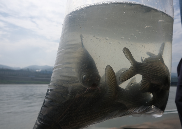 工作人員將珍稀特有魚緩緩放入滑槽中。周小平攝