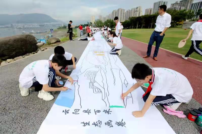 早上8點,來自云陽縣實驗小學(xué)六年級的百余名學(xué)生在老師的帶領(lǐng)下早早來到了活動現(xiàn)場!胺浅<樱蠋熣f我們今天要來一起完成一幅長卷。”六年級2班李妍錫同學(xué)激動不已。