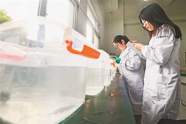 西南大學(xué)水產(chǎn)學(xué)院漁業(yè)資源與保護(hù)學(xué)實(shí)驗(yàn)室,科研人員查看魚苗生長(zhǎng)情況。