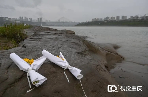 市民在江邊給王老師獻花。圖片來源于視覺重慶