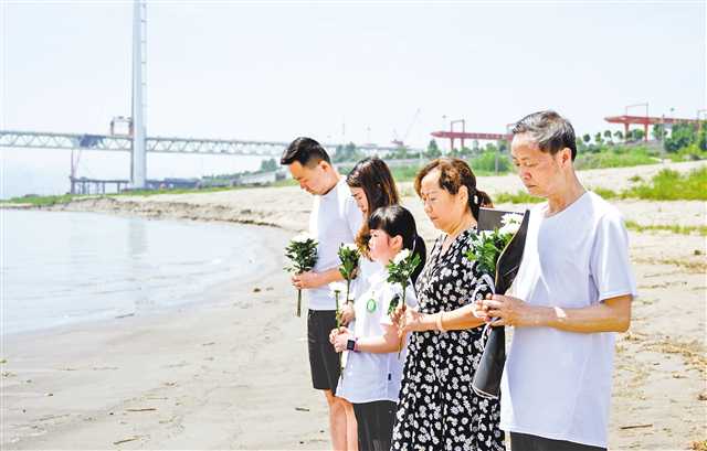 六月五日,大渡口區(qū)萬發(fā)碼頭長江邊上,目睹了事發(fā)全過程的王顯才老人帶著全家前來悼念王紅旭老師。記者 解小溪 攝\視覺重慶