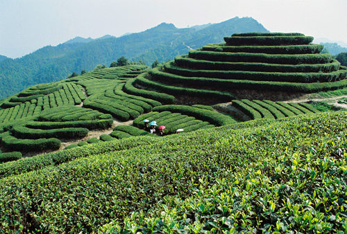 在那一層層茶梯之間,數(shù)名采茶女戴著布衣遮陽(yáng)帽,腰挎圓筒形竹質(zhì)茶簍,來(lái)回穿梭茶樹(shù)其間,手指快速翻飛,在茶樹(shù)頭上拔芽打尖。歡笑聲、歌唱聲在山坡回旋,點(diǎn)綴在茶園深處,構(gòu)成了茶山上一幅幅美麗的風(fēng)景。