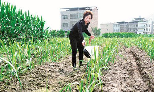 熊壽碧在給甘蔗澆水。通訊員 李泉 攝
