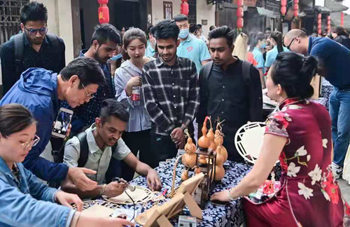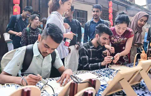 展演結(jié)束后,來自貝寧、孟加拉國、烏克蘭、俄羅斯等多個國家的學(xué)徒代表遞上拜師帖,喝下拜師茶,正式向巴南的木洞山歌、大渡口的堰興剪紙、九龍坡的烙畫等國家、市級“非遺”傳承人拜師學(xué)藝。