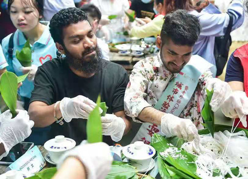 為了讓外國友人們在異鄉(xiāng)感受到家的溫暖,主辦方邀請他們一起包粽子、劃旱龍舟,以解鄉(xiāng)愁。