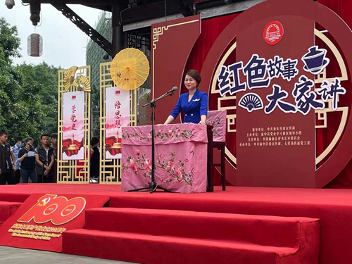 “今天我給大家講一位黨員的故事,這位黨員很有名,他就是我們敬愛的周總理!爆F(xiàn)場著名評書表演藝術(shù)家、國家級非遺四川評書代表性傳承人曾令弟聲情并茂地向大家講述了四川評書節(jié)目《人民在上》,分享了周恩來總理體貼老百姓的故事。