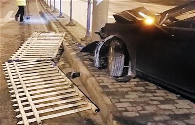在現場,一輛黑色轎車撞倒道路中央的一片隔離護欄,車頭、護欄嚴重受損,駕駛員頭部受輕微傷。民警對駕駛員進行檢測,排除了他酒駕、毒駕嫌疑。