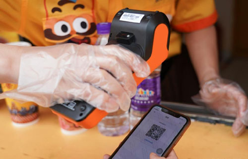 6月16日,北京歡樂谷一商戶使用POS機對使用數(shù)字人民幣的消費者進行掃碼收款。