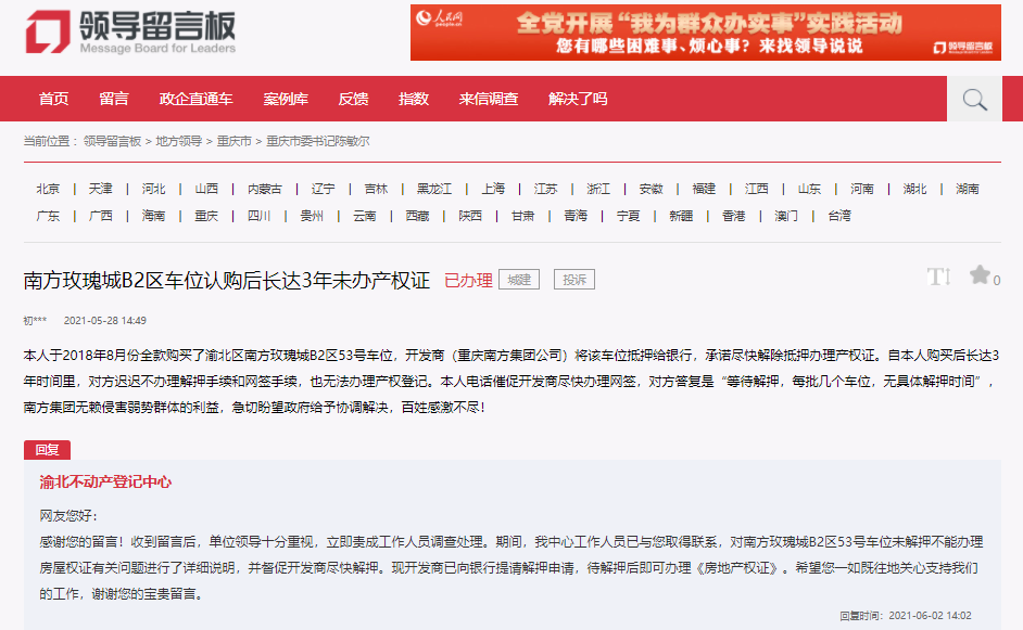 原來(lái),該網(wǎng)友5月28日在留言中反映,他于2018年8月全款購(gòu)買了渝北區(qū)南方玫瑰城一車位,開發(fā)商將該車位抵押給銀行,承諾盡快解除抵押辦理產(chǎn)權(quán)證?墒,購(gòu)買后長(zhǎng)達(dá)3年時(shí)間,對(duì)方遲遲不辦理解押手續(xù)和網(wǎng)簽手續(xù),也無(wú)法辦理產(chǎn)權(quán)登記。經(jīng)多次催促,對(duì)方答復(fù)“等待解押,每批幾個(gè)車位,無(wú)具體解押時(shí)間!