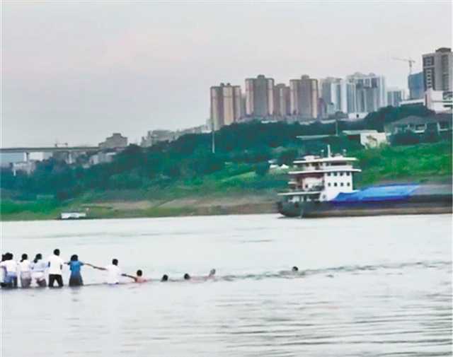 激流滾滾的長(zhǎng)江邊,十幾名市民手拉手呼喊著,從岸邊淺灘一直向江心延伸,組成一條長(zhǎng)達(dá)二三十米的“人鏈”。他們中,站位最淺的小腿淹沒在江水中,站位最深的僅剩一個(gè)頭露出江面。