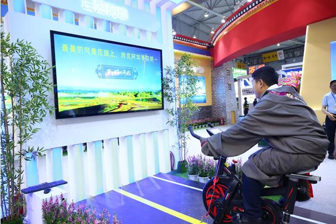 緊鄰的四川阿壩州館充滿地域特色,館內(nèi)設(shè)置了一輛連接電腦的動(dòng)感單車,參觀者可以體驗(yàn)一把騎行漫游風(fēng)景秀麗的阿壩州。