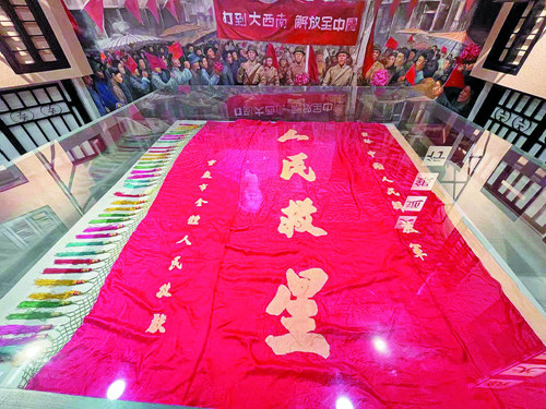 12月1日,重慶舉行了入城儀式,市民們給入城的解放軍送上了一面自己制作的“紅旗”,在這面巨大的紅旗上,寫著“獻給中國人民解放軍”“人民救星”“重慶市全體人民敬”字樣,表達了重慶人民熱愛共產(chǎn)黨,盼望新生活的強烈愿望。