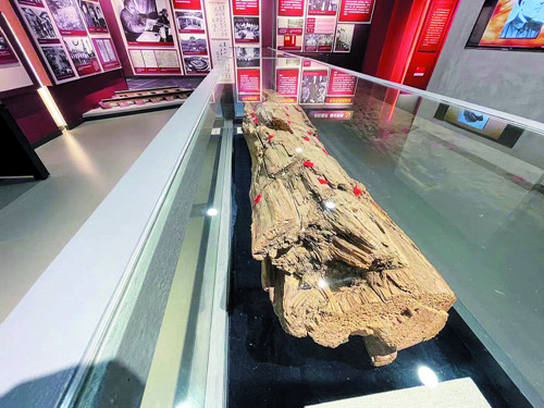 這是一根一眼看上去很普通的樹樁,可它卻被陳列在了展廳的正中位置,只有當你走到它身邊,近距離觀看才能發(fā)現(xiàn),在這截面積僅2平方米的樹樁上,留有彈孔、彈痕約41個。