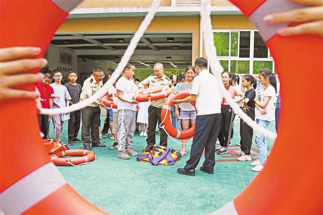6月23日,在北碚區(qū)澄江小學(xué),交通執(zhí)法人員給孩子們講解救生圈使用方法。