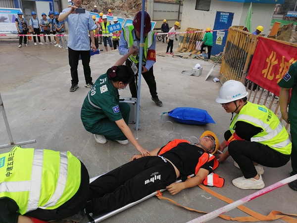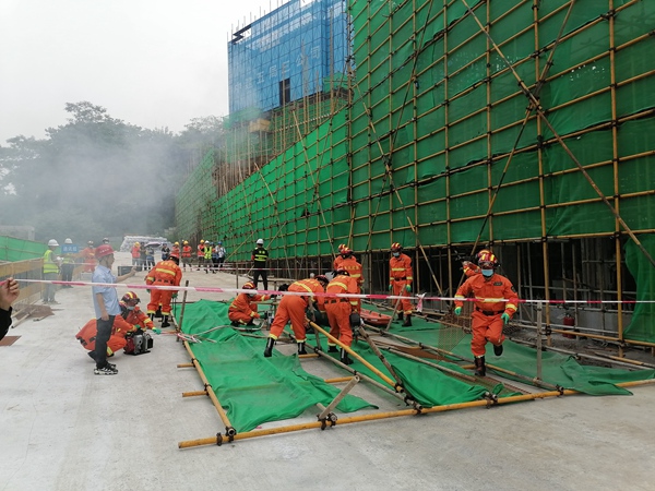 “腳手架坍塌事故應(yīng)急演練”現(xiàn)場。中建五局三公司供圖