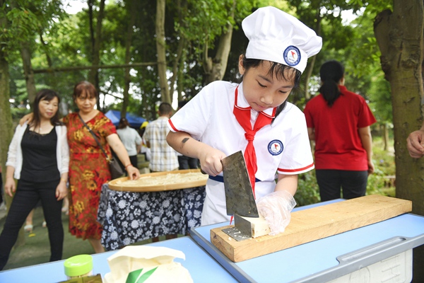 在一旁的民俗園中,孩子們在老師的帶領(lǐng)下,搭起涼棚,開展石磨豆花、包粽子、打糍粑、手切桃片等傳統(tǒng)民俗勞動,用荷田里的荷花等原材料研制飲料、小吃等系列產(chǎn)品。“先是炒米,然后磨粉……最后是切片和包裝!眮碜院洗ò褪裥W(xué)四年級的學(xué)生劉智宸,一邊向圍觀的叔叔阿姨們介紹制作合川桃片的流程,一邊操作著切刀,動作嫻熟地切著桃片。