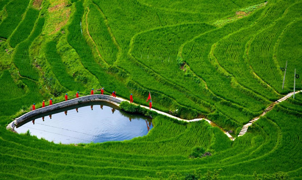 6月8日,在重慶市酉陽縣花田鄉(xiāng)何家?guī)r村,萬畝梯田層層疊疊綠意盎然,蜿蜒的田埂在云霧中若隱若現(xiàn),美不勝收。
