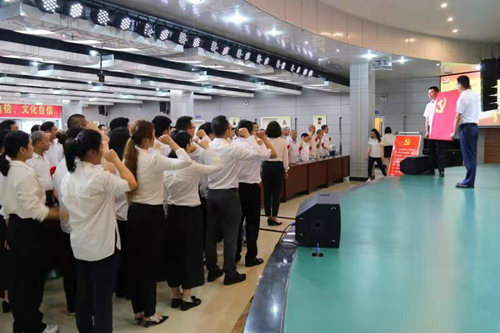 現(xiàn)場,工作人員為每位入黨50年的老黨員戴上大紅花,老黨員們同年輕黨員、新黨員一道齊唱國歌、重溫入黨誓詞,街道相關人員們?yōu)槔宵h員佩戴“光榮在黨50年”紀念章。