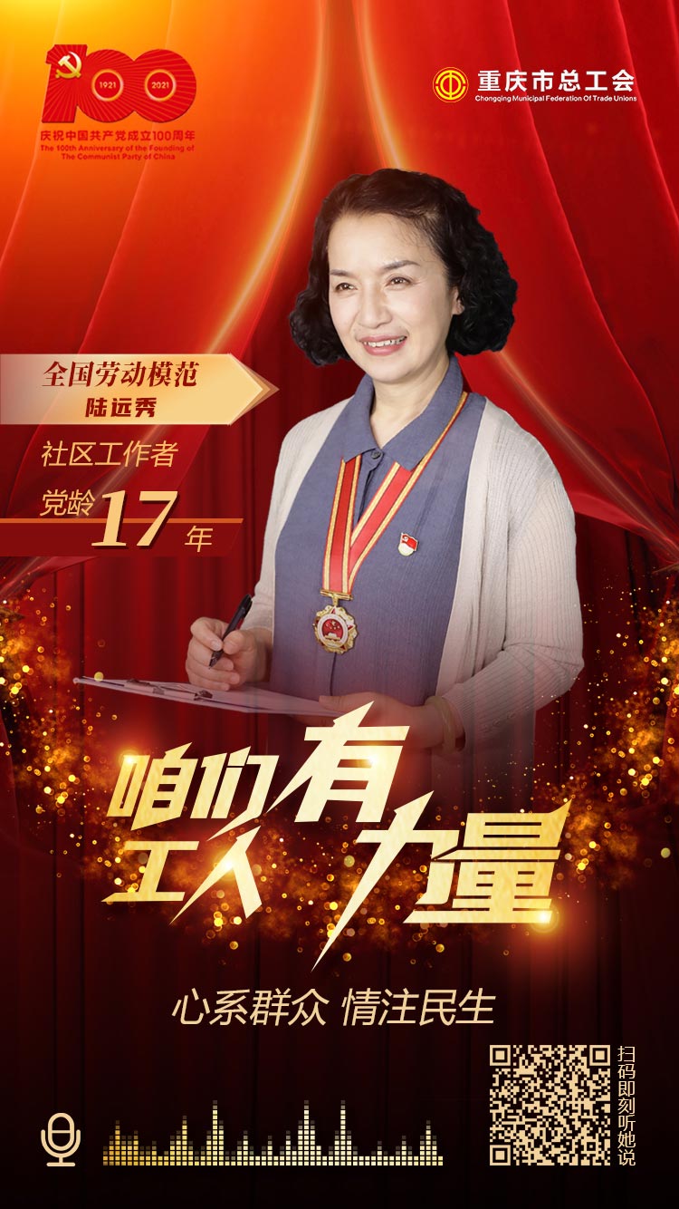 我是全國勞動(dòng)模范陸遠(yuǎn)秀,入黨17年了,我是一名社區(qū)黨委書記,群眾滿意的笑臉給了我力量,讓我一直走在建設(shè)文明社區(qū)、和諧社區(qū)的路上。