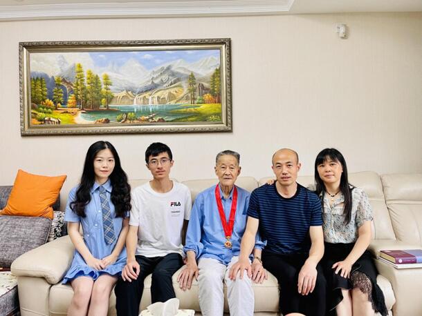 劉德正戴著“光榮在黨50年”紀念章與家人合影。黃博智攝