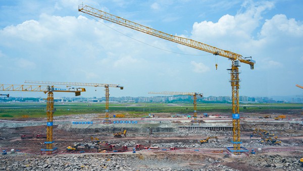 在位于江北機(jī)場T3A航站樓北側(cè)的施工現(xiàn)場,20余臺(tái)塔吊整齊排列,正在進(jìn)行有序的吊裝作業(yè)。挖掘機(jī)、推土機(jī)、鉤機(jī)等施工機(jī)械轟鳴忙碌,運(yùn)土車、灑水車等工程車輛來回穿梭,現(xiàn)場一片熱火朝天的景象。