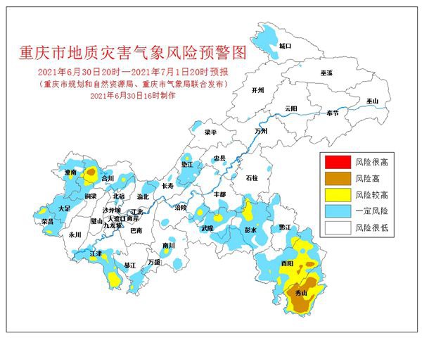 人民網(wǎng)重慶6月30日電 6月30日16時,重慶市規(guī)劃和自然資源局、重慶市氣象局聯(lián)合發(fā)布全市地質(zhì)災(zāi)害氣象風(fēng)險預(yù)警。