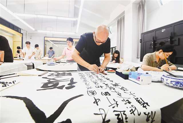 7月1日,四川美術(shù)學(xué)院,師生們正在書寫習(xí)近平總書記在慶祝中國(guó)共產(chǎn)黨成立100周年大會(huì)上的講話金句。首席記者 龍帆 攝/視覺重慶