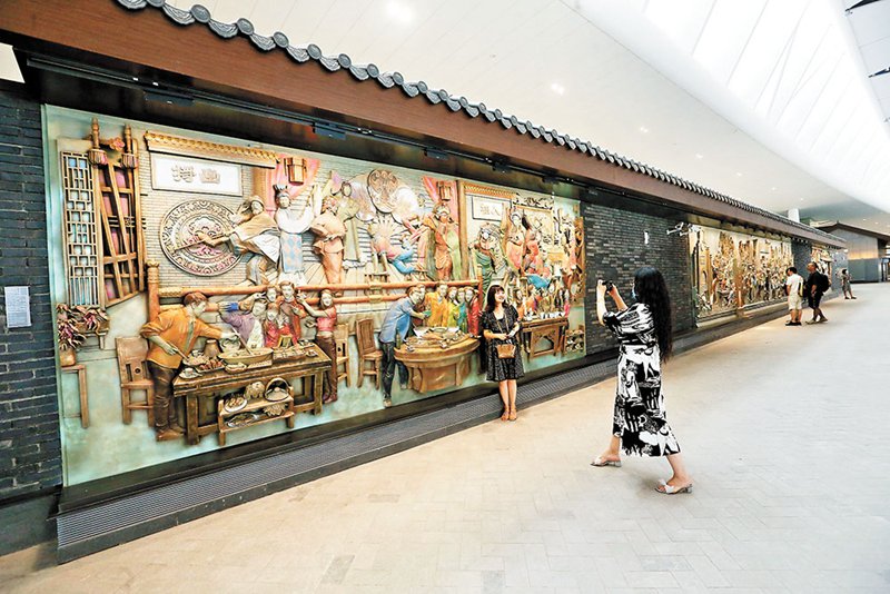 布置在出發(fā)大廳“天府巷”的壁畫(huà)作品,也十分精彩。記者看到,壁畫(huà)上有正在刺繡、吹糖人的非遺傳承人,有品茶的市民,有玩滑板的青少年,描繪出成都百姓多姿多彩的美好生活!按浪囆g(shù)家非常了解成都人的生活狀態(tài),因此在創(chuàng)作壁畫(huà)《潮流都市》《蓉城意味》等作品時(shí)很有感覺(jué)!睆埥芙榻B,這些壁畫(huà)采用線描造型、數(shù)碼技術(shù)、傳統(tǒng)鑄銅工藝等技法,將歷史、現(xiàn)在、未來(lái)串聯(lián)起來(lái),用豐富的視覺(jué)效果,體現(xiàn)成都獨(dú)有的傳統(tǒng)韻味和當(dāng)代氣息。