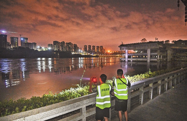 7月13日凌晨,沙坪壩區(qū)磁器口,工作人員正在沿江區(qū)域巡邏,查看水位。首席記者 龍帆 攝/視覺重慶