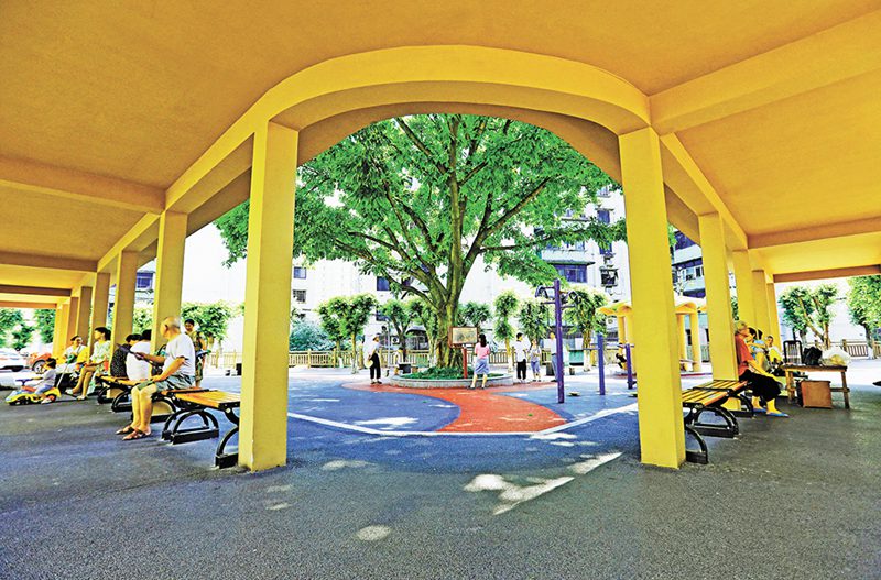 早上9點(diǎn)剛過(guò),九龍四村的休閑長(zhǎng)廊上,坐了20多個(gè)居民。他們有的搖著蒲扇,和鄰居輕聲聊天;有的看著孩子玩耍、嬉戲,臉上洋溢著笑容。