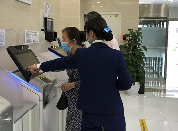 指導(dǎo)老年人在自助機(jī)具上辦理業(yè)務(wù)。交行重慶市分行供圖