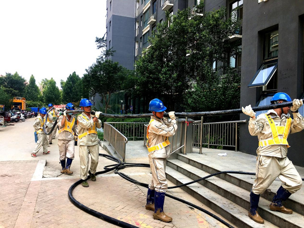 搶修人員在鄭州濱河花園小區(qū)施放電纜。宋世光攝