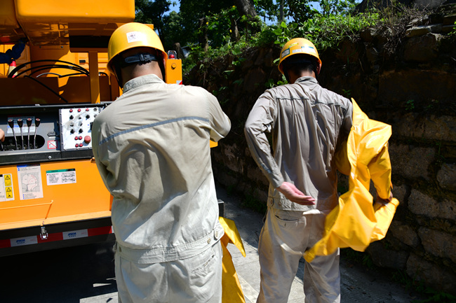 國(guó)網(wǎng)重慶電力員工高溫作業(yè)中汗水已打濕了全身。周一瞥攝