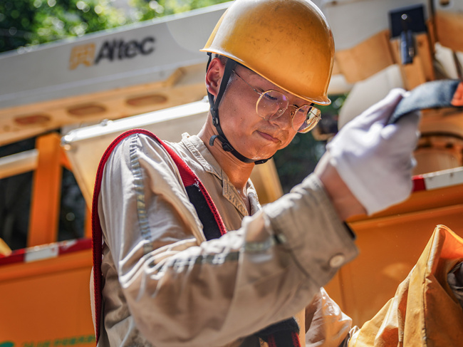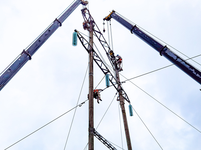 國(guó)網(wǎng)重慶電力員工在烈日高溫下進(jìn)行桿上檢修作業(yè)。劉遠(yuǎn)平攝