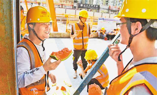 8月3日下午5點過,天氣炎熱,軌道交通10號線蘭花路站施工現(xiàn)場,工人們聚在一起吃西瓜,準(zhǔn)備開始下午的工作。