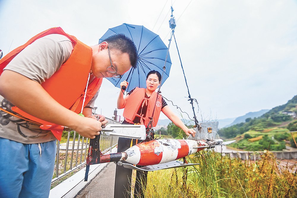 8月8日,開(kāi)州區(qū)臨江水文監(jiān)測(cè)站,黃菁玨(左)和孟釔杉(右)正在安裝水流監(jiān)測(cè)設(shè)備。首席記者 龍帆 攝/視覺(jué)重慶