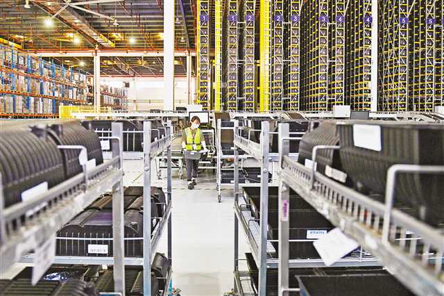 重慶飛力達(dá)供應(yīng)鏈自動化立體倉庫,整個工作場地只有幾個工人在分揀貨物。記者 崔力 攝/視覺重慶