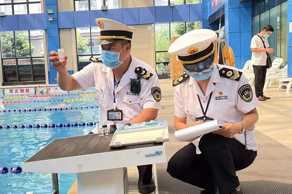 衛(wèi)生監(jiān)督員檢查游泳場(chǎng)所衛(wèi)生現(xiàn)場(chǎng)。榮昌區(qū)衛(wèi)生健康執(zhí)法支隊(duì)供圖