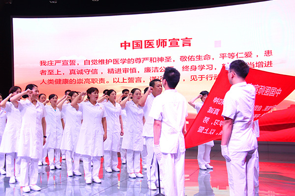 “我莊嚴(yán)宣誓:自覺維護醫(yī)學(xué)的尊嚴(yán)和神圣,敬佑生命,救死扶傷;甘于奉獻,大愛無疆;平等仁愛,患者至上……”在副院長馮毅的帶領(lǐng)下,醫(yī)師代表上臺宣誓。