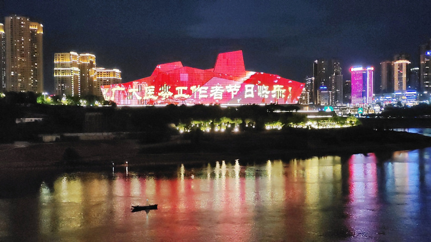 重慶大劇院點亮燈光,向醫(yī)務(wù)工作者致敬,送上節(jié)日祝福。石濤 攝